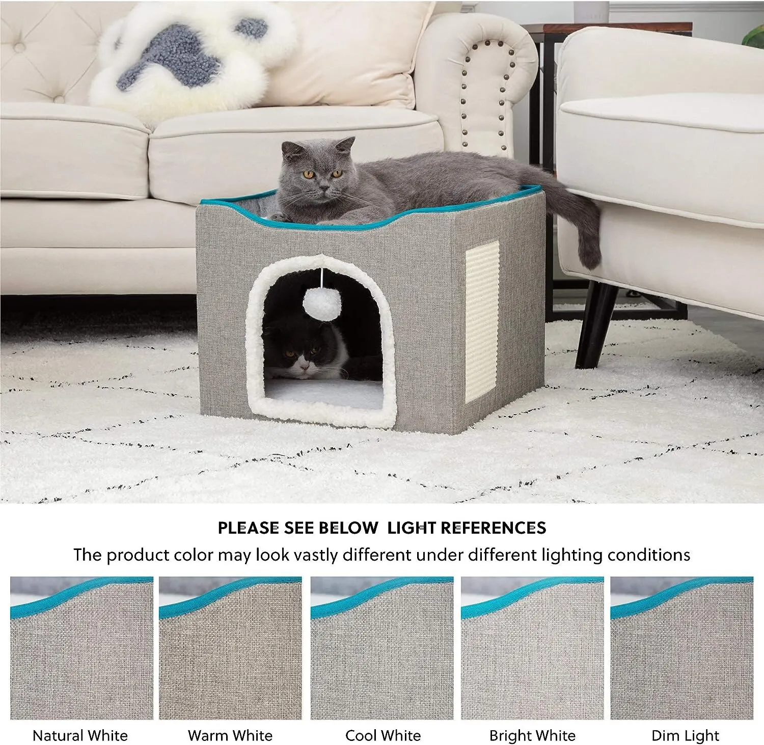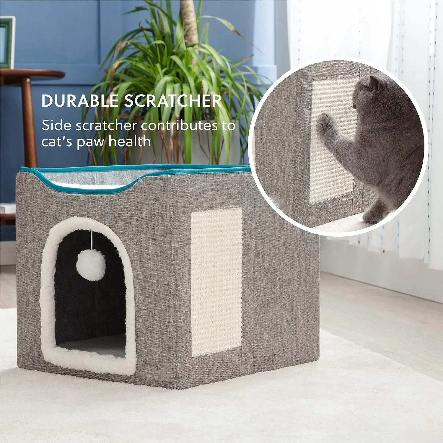 Cat hideaway made from pet-friendly MDF materials and soft lambs wool fabric. This large cat house is equipped with a durable sisal scratching board and plush hanging ball to keep your cat engaged and happy.